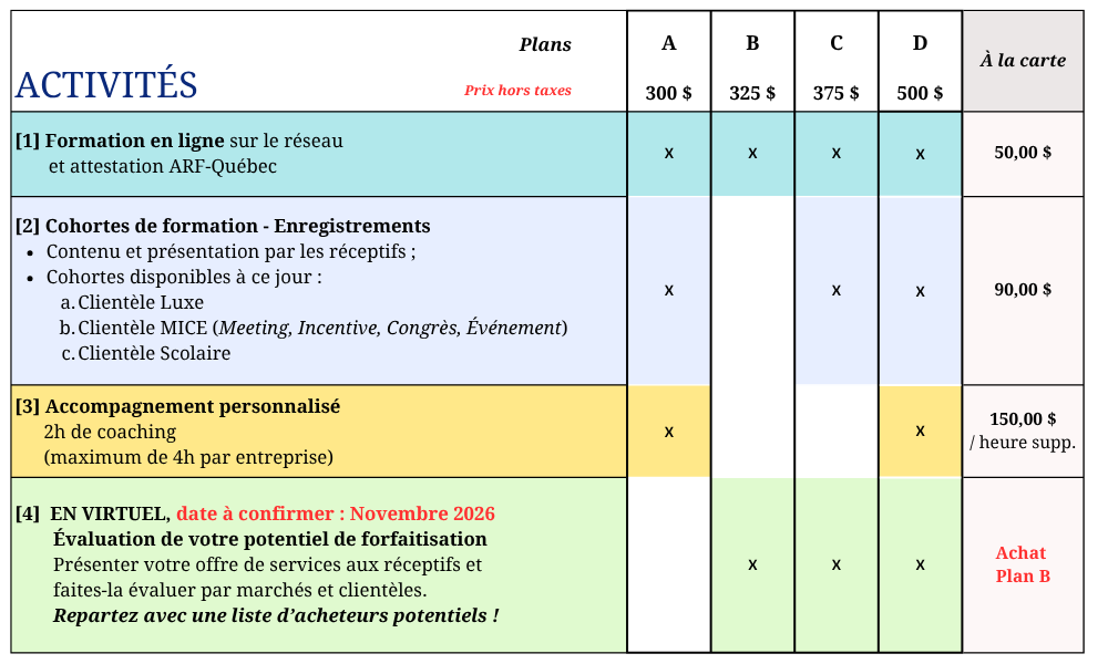 L'objectif ? Rendre les entreprises en région prêtes à la forfaitisation internationale afin d’accroitre leurs revenus touristiques en provenance de l’international, en mettant l'accent sur le développement d'une offre plus adaptée et personnalisée. Nous visons à former plus de 300 entreprises touristiques, attraits ou activités des régions du Québec, et ce, en partenariat avec les ATR et ATS du Québec. Au final, nous participerons à un réseau de distribution plus fort et engagé à développer une offre touristique accrue en régions rurales et éloignées. Entreprises touristiques, choisissez la formule la plus adaptée pour vous!Choisissez parmi nos 4 activités pour une formation continue personnalisée et à votre rythme : |