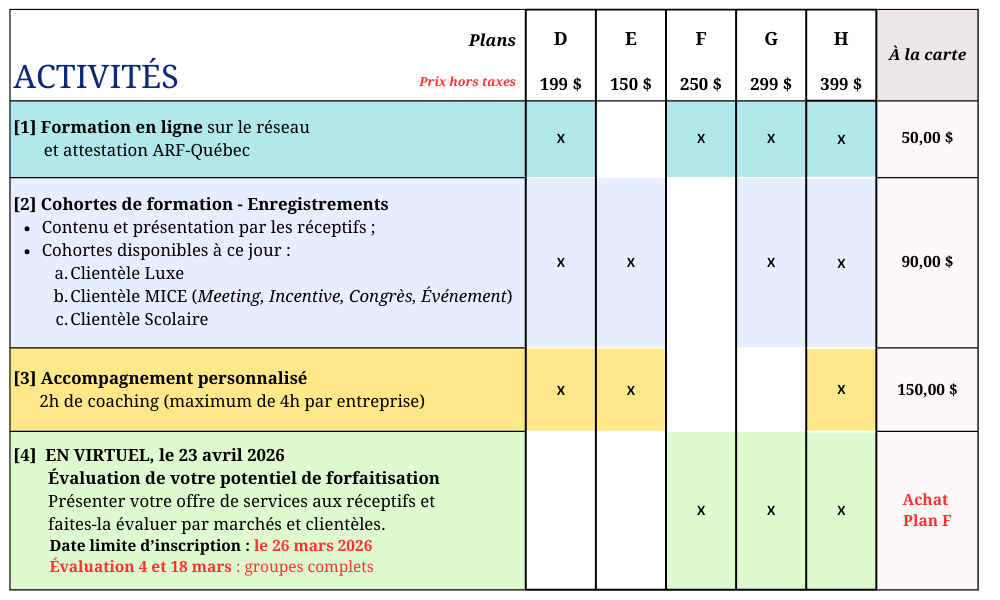 L'objectif ? Rendre les entreprises en région prêtes à la forfaitisation internationale afin d’accroitre leurs revenus touristiques en provenance de l’international, en mettant l'accent sur le développement d'une offre plus adaptée et personnalisée. Nous visons à former plus de 300 entreprises touristiques, attraits ou activités des régions du Québec, et ce, en partenariat avec les ATR et ATS du Québec. Au final, nous participerons à un réseau de distribution plus fort et engagé à développer une offre touristique accrue en régions rurales et éloignées. Entreprises touristiques, choisissez la formule la plus adaptée pour vous!Choisissez parmi nos 4 activités pour une formation continue personnalisée et à votre rythme : |